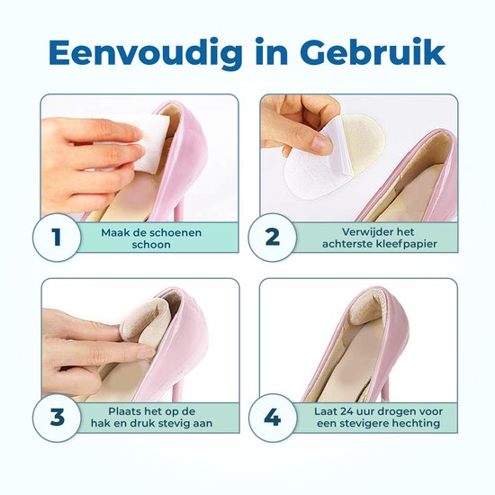 Maak de hiel van de schoen schoon, verwijder de plakstrip, plaats het kussentje en druk stevig aan. Laat 24 uur rusten voor optimale hechting.