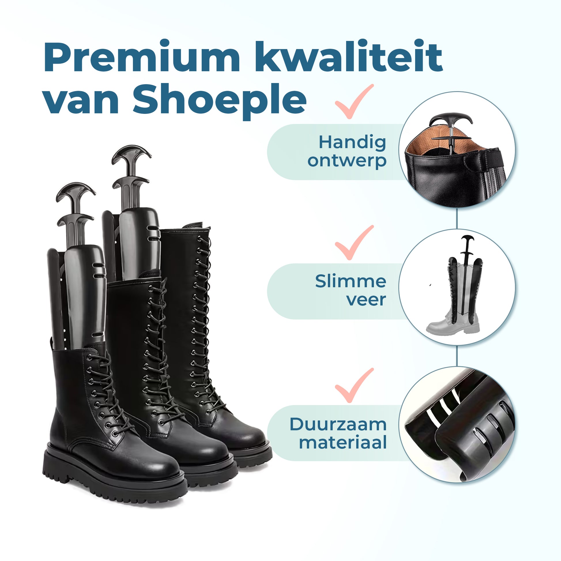 Niets zo frustrerend als slappe laarzen of diepe kreukels in je favoriete paar. Met de Shoeple laarzenspanners van 29 cm blijven je laarzen netjes rechtop, zonder kreukels of ingezakte schachten. Zo zien ze er elke dag uit alsof je ze net uit de doos haalt.