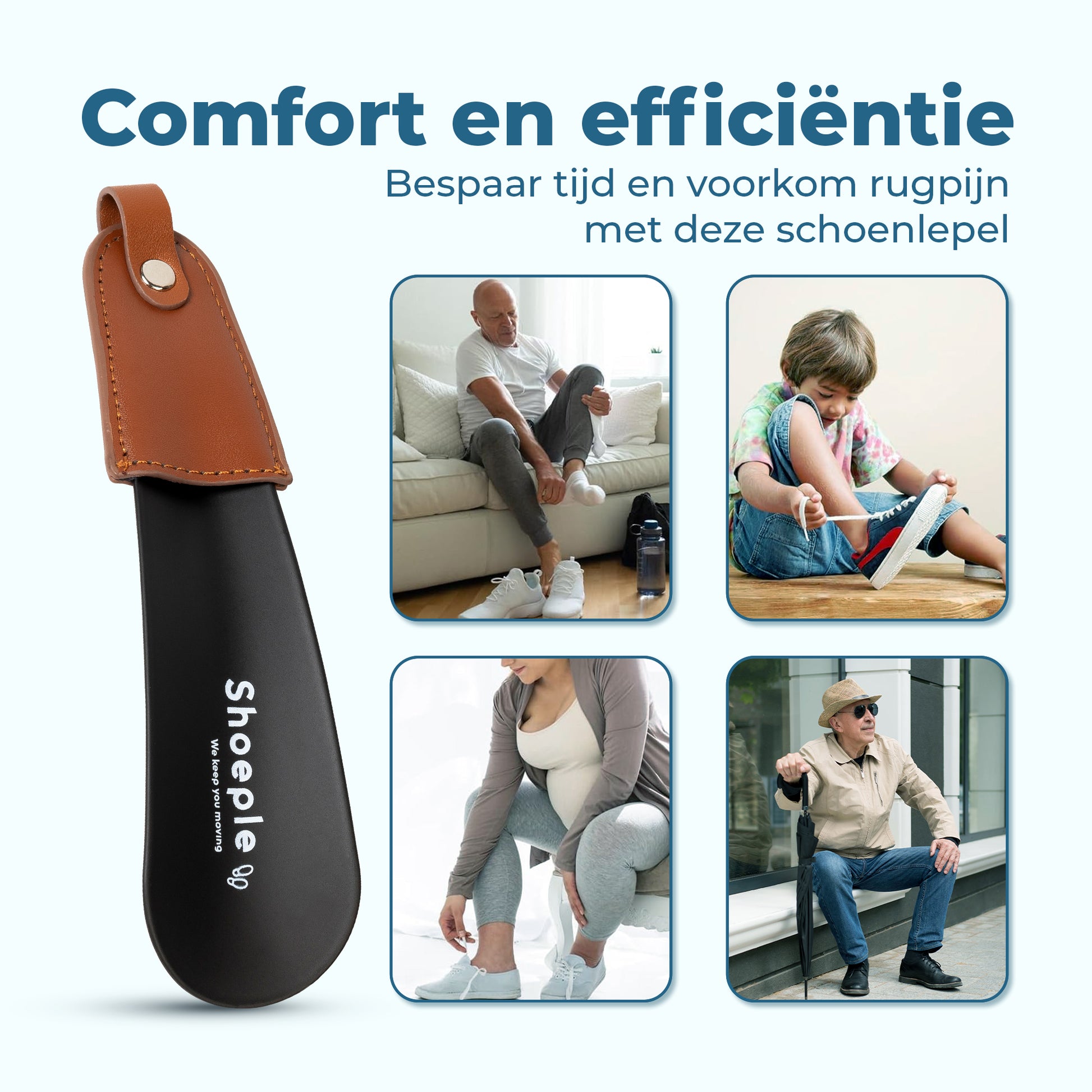 Plaats de lepel in de hiel van je schoen, schuif je voet naar binnen en laat de lepel rustig terugglijden. Zo bespaar je tijd én houd je je schoenen in topvorm – elke dag opnieuw.